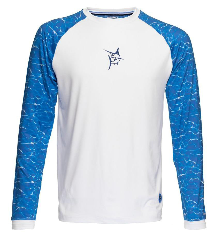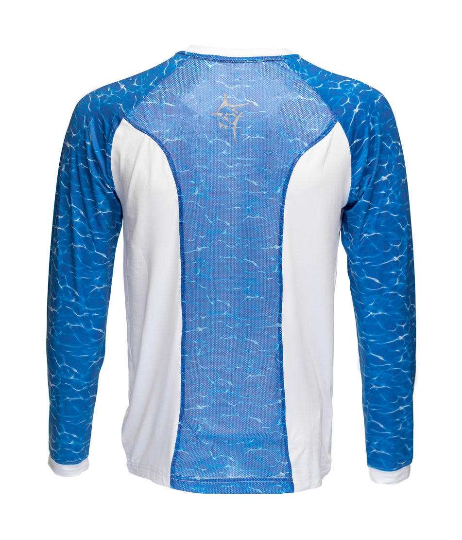 For those long runs to the deep when you need sun protection but also need to stay cool. Ultimate for both. Featuring the softest performance fabric created in a UV50, moisture wicking, quick dry with all way stretch. Raglan long sleeve with center back ultra-mesh in our exclusive water print. Never seen before Patent Pending Ultra Flex Grip. Those days of the open cuff stained sleeves are gone. Now when you are rigging your baits or just want to stay cool, raise your sleeve cuffs and they will stay in place with our silicone sleeve grip. A tri-colored silicone band around the interior sleeve cuff will keep your cuffs in place and clean.