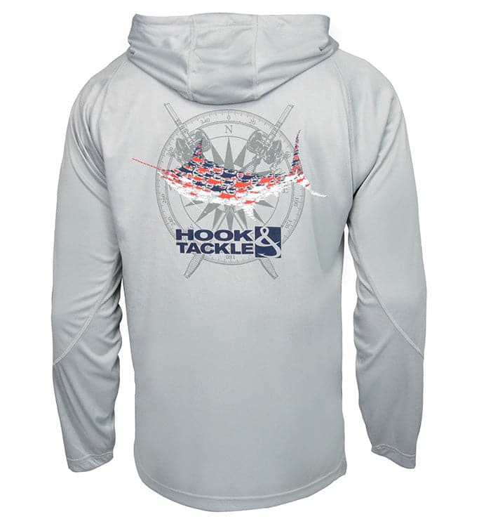 Protect yourself from the sun’s harmful UV rays with the Hook & Tackle Compass Rods Hoodie performance fishing shirt. Proprietary Solar System UPF 50+ rated fabric incorporates the latest sun protection technology. Wicked Dry & Cool fabric technology wicks moisture from the skin to enhance your comfort level. Designed with radial sleeves to allow you a full range of movement when casting or reeling in.