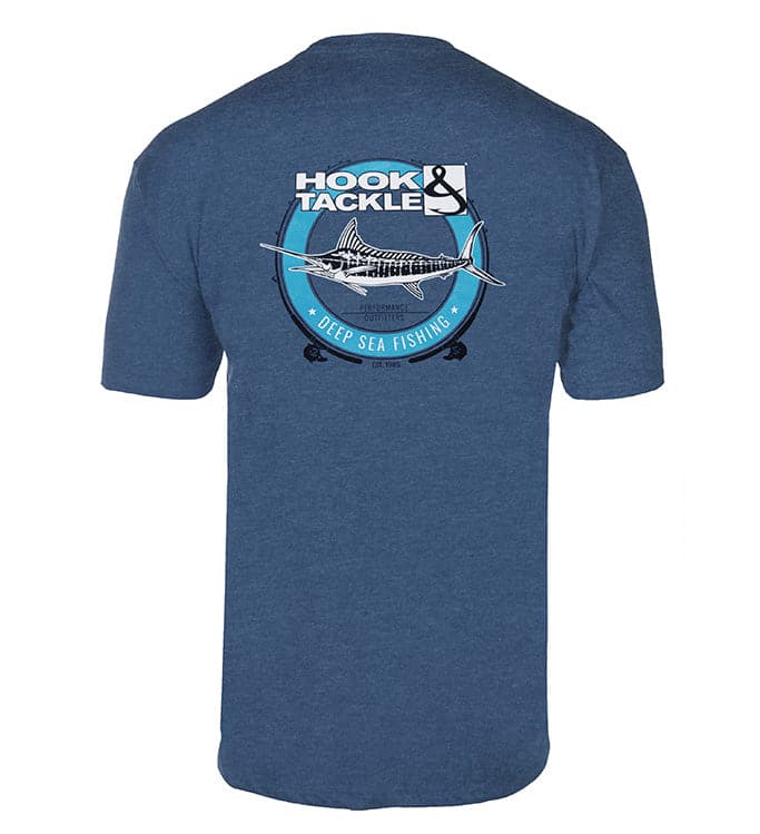 A marlin framed by fishing rods appear on the back of this Hook & Tackle® Sun Protection short sleeve pocket fishing t-shirt. This shirt also features a Hook & Tackle® logo on the sleeve and the ampersand hook logo on the front.