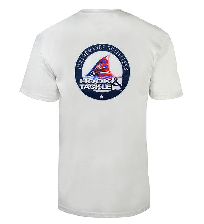 A redfish tail graphic is depicted on the back of this Hook & Tackle® Sun Protection short sleeve pocket fishing t-shirt. This shirt also features a Hook & Tackle® logo on the sleeve and the ampersand hook logo on the front.
