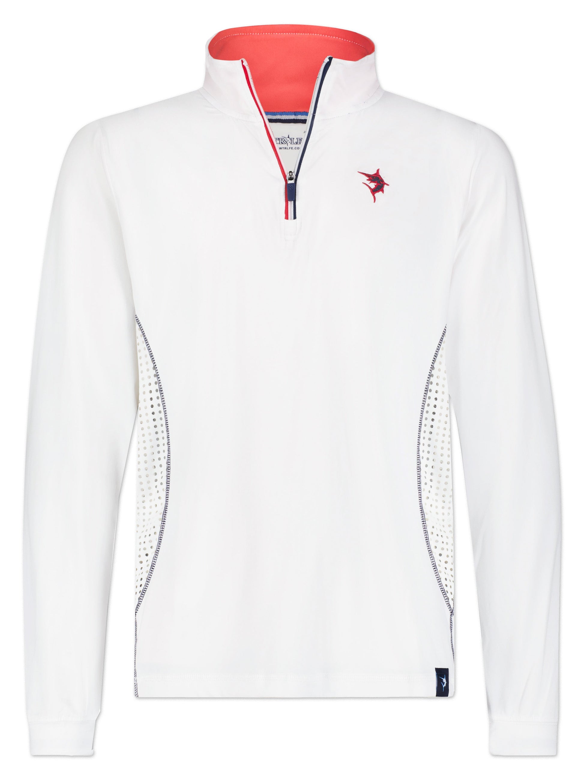 Light weight performance quarter zip featuring soft poly spandex wicking fabric. Sun Protection, UV50 with laser insert venting to keep you cool when needed and patented silicone sleeve grip which holds your sleeves in place and keeps them clean. Perfect for every day.
