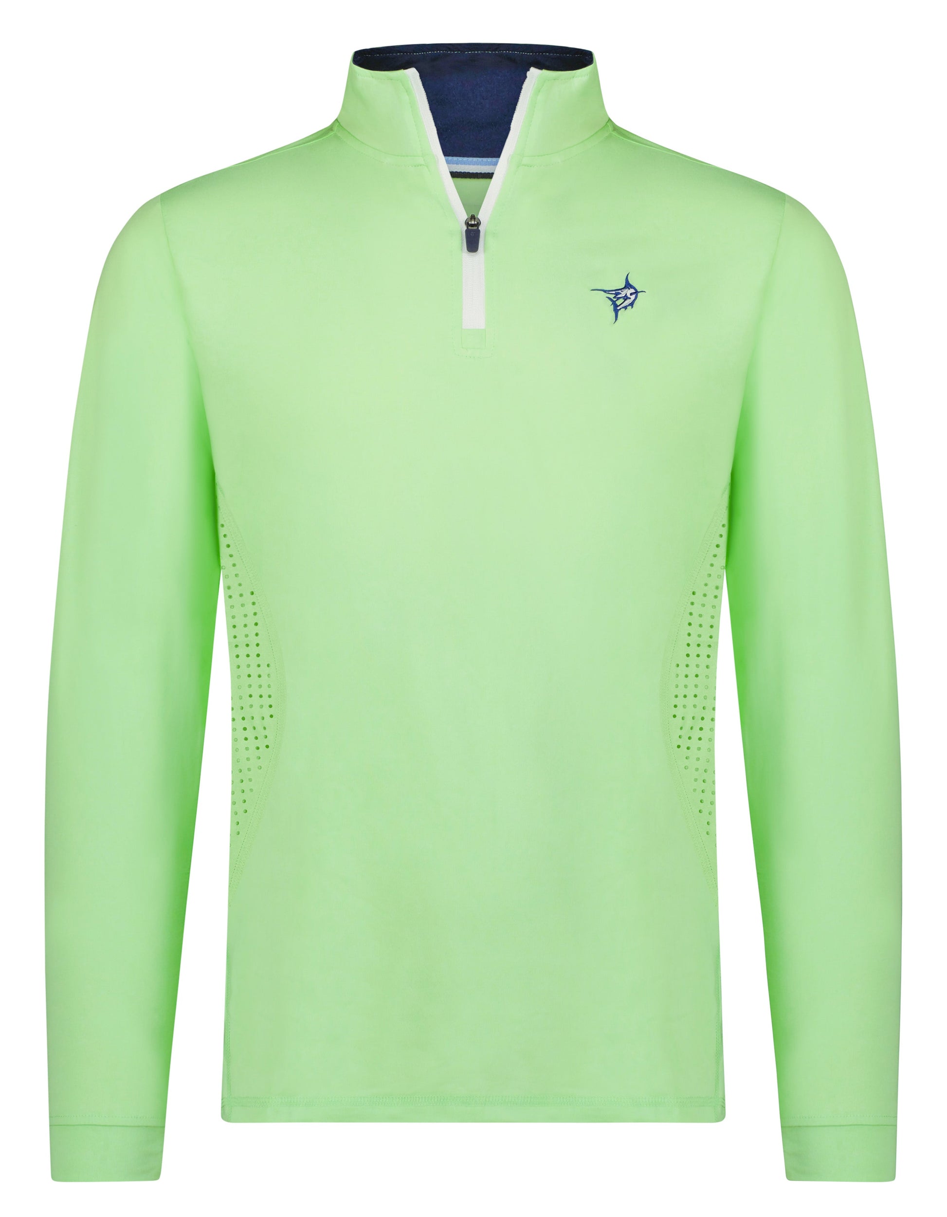 Light weight performance quarter zip featuring soft poly spandex wicking fabric. Sun Protection, UV50 with laser insert venting to keep you cool when needed and patented silicone sleeve grip which holds your sleeves in place and keeps them clean. Perfect for every day.
