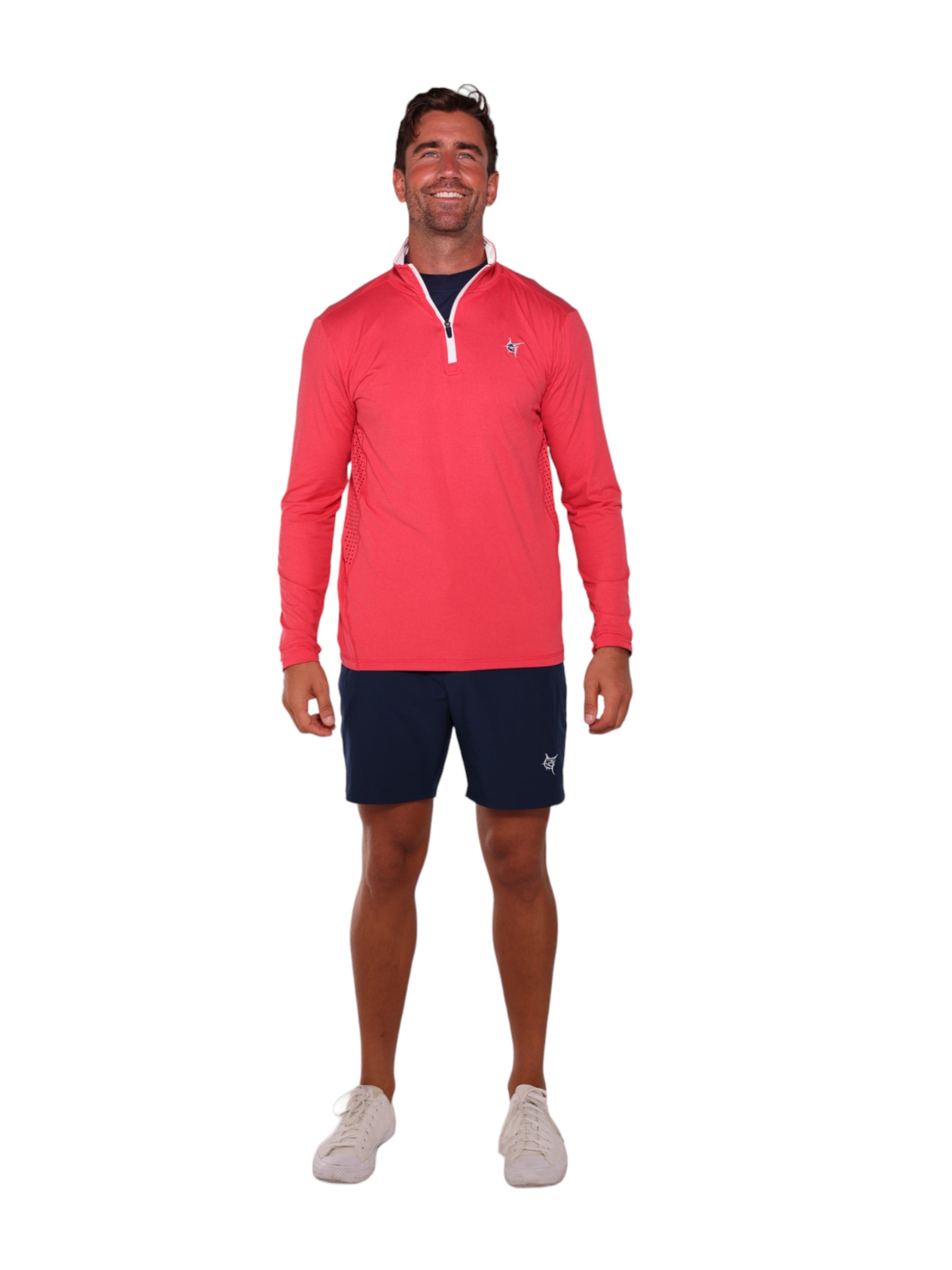 Light weight performance quarter zip featuring soft poly spandex wicking fabric. Sun Protection, UV50 with laser insert venting to keep you cool when needed and patented silicone sleeve grip which holds your sleeves in place and keeps them clean. Perfect for every day.