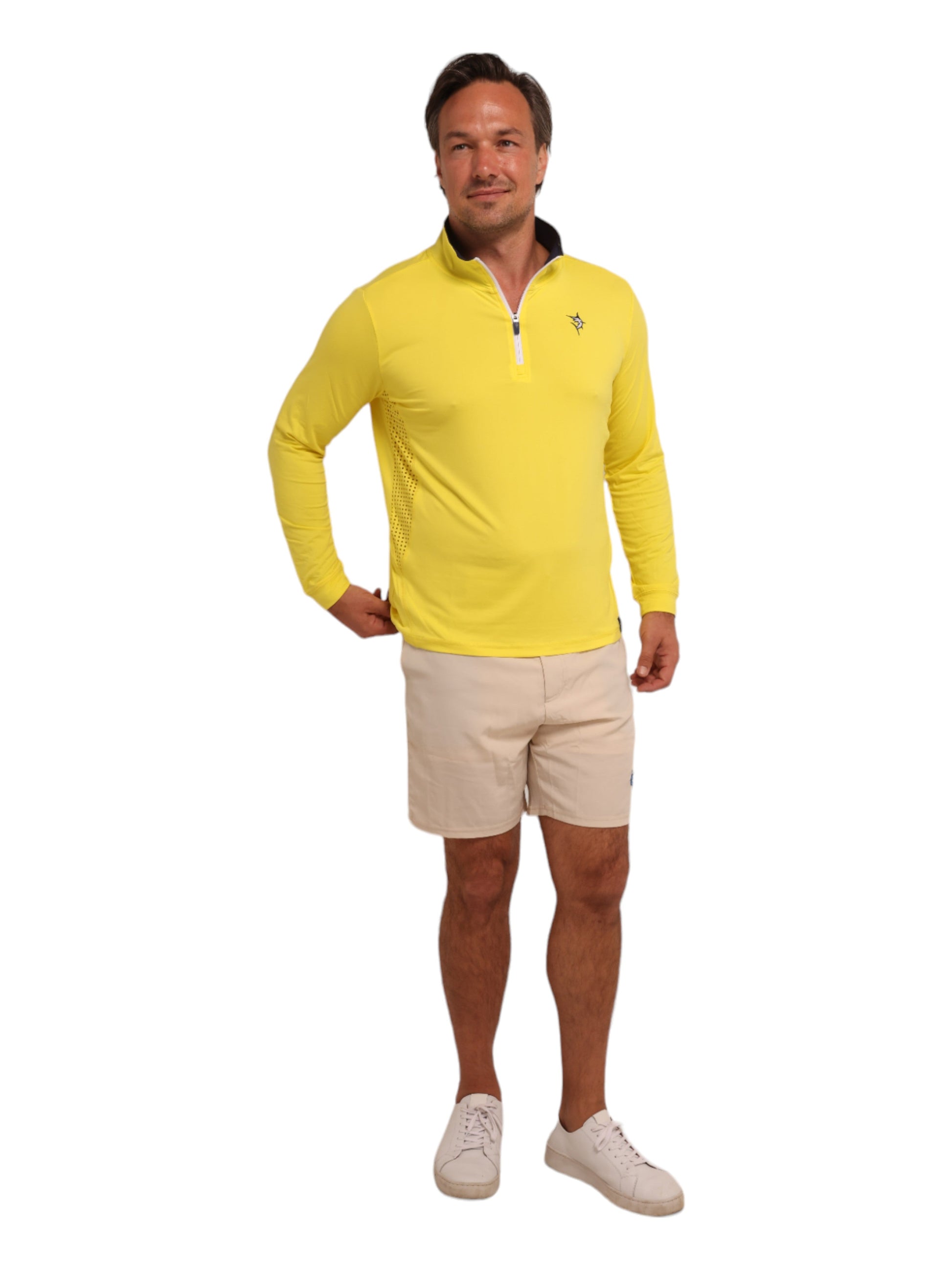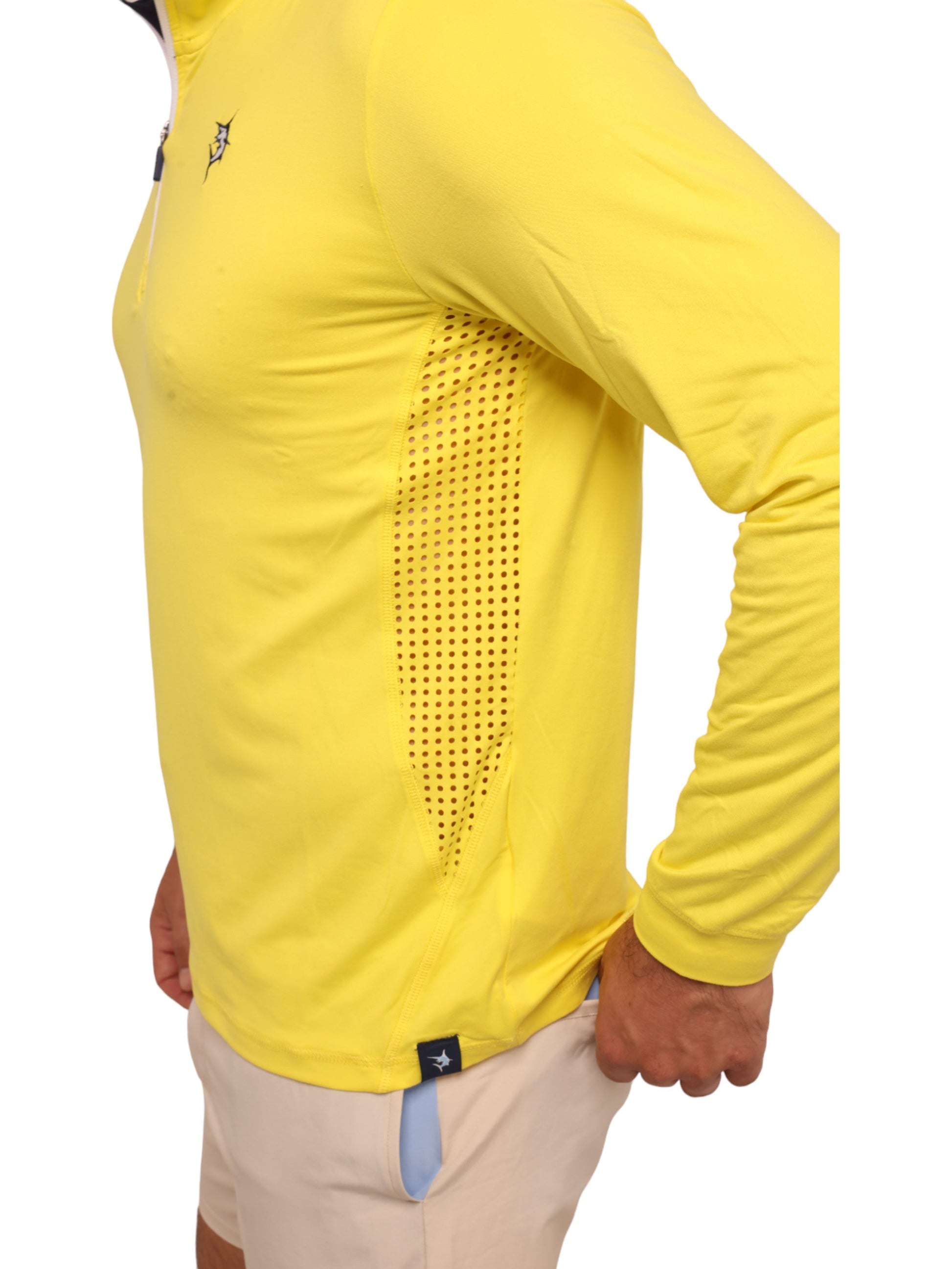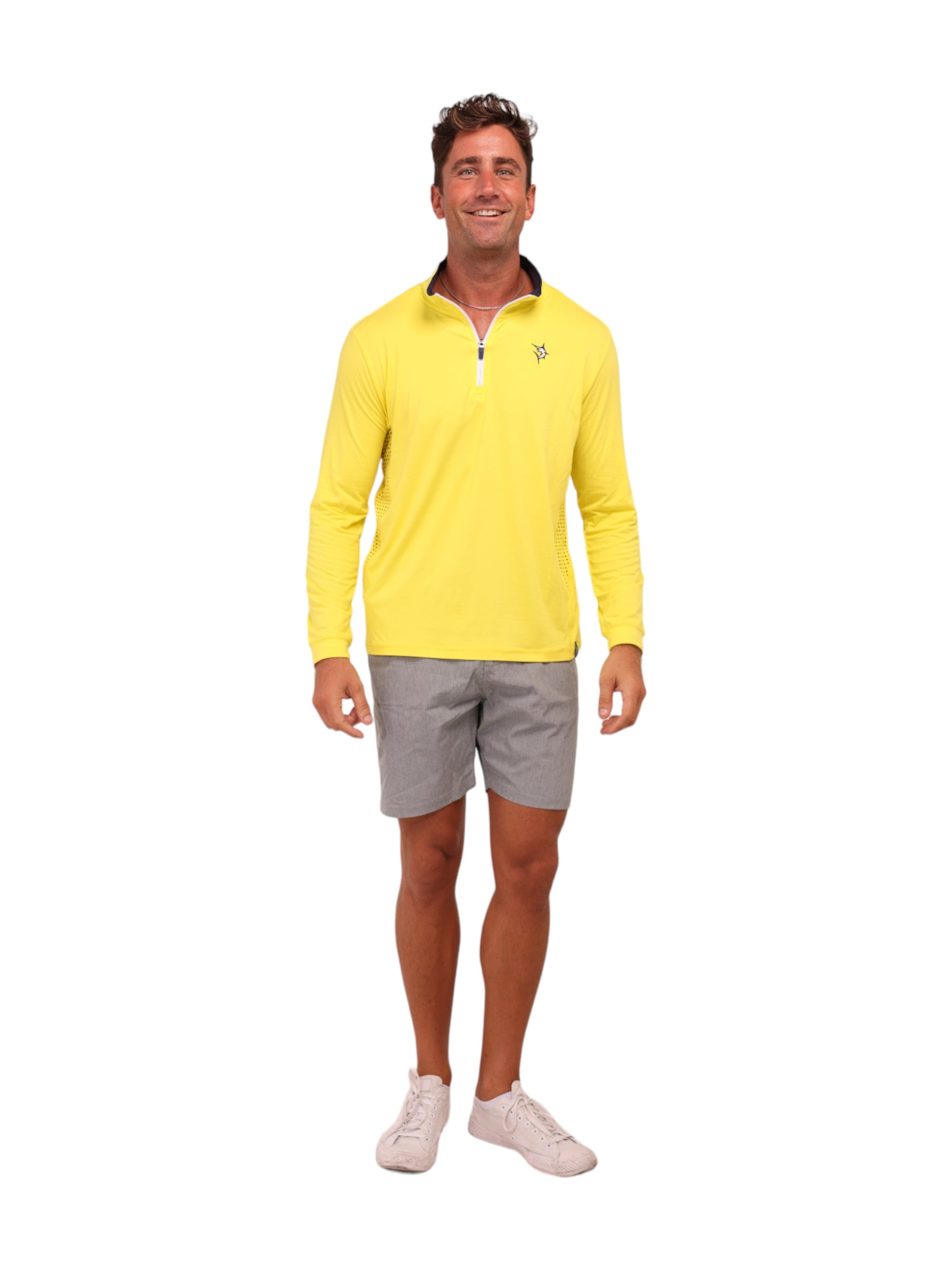 Light weight performance quarter zip featuring soft poly spandex wicking fabric. Sun Protection, UV50 with laser insert venting to keep you cool when needed and patented silicone sleeve grip which holds your sleeves in place and keeps them clean. Perfect for every day.