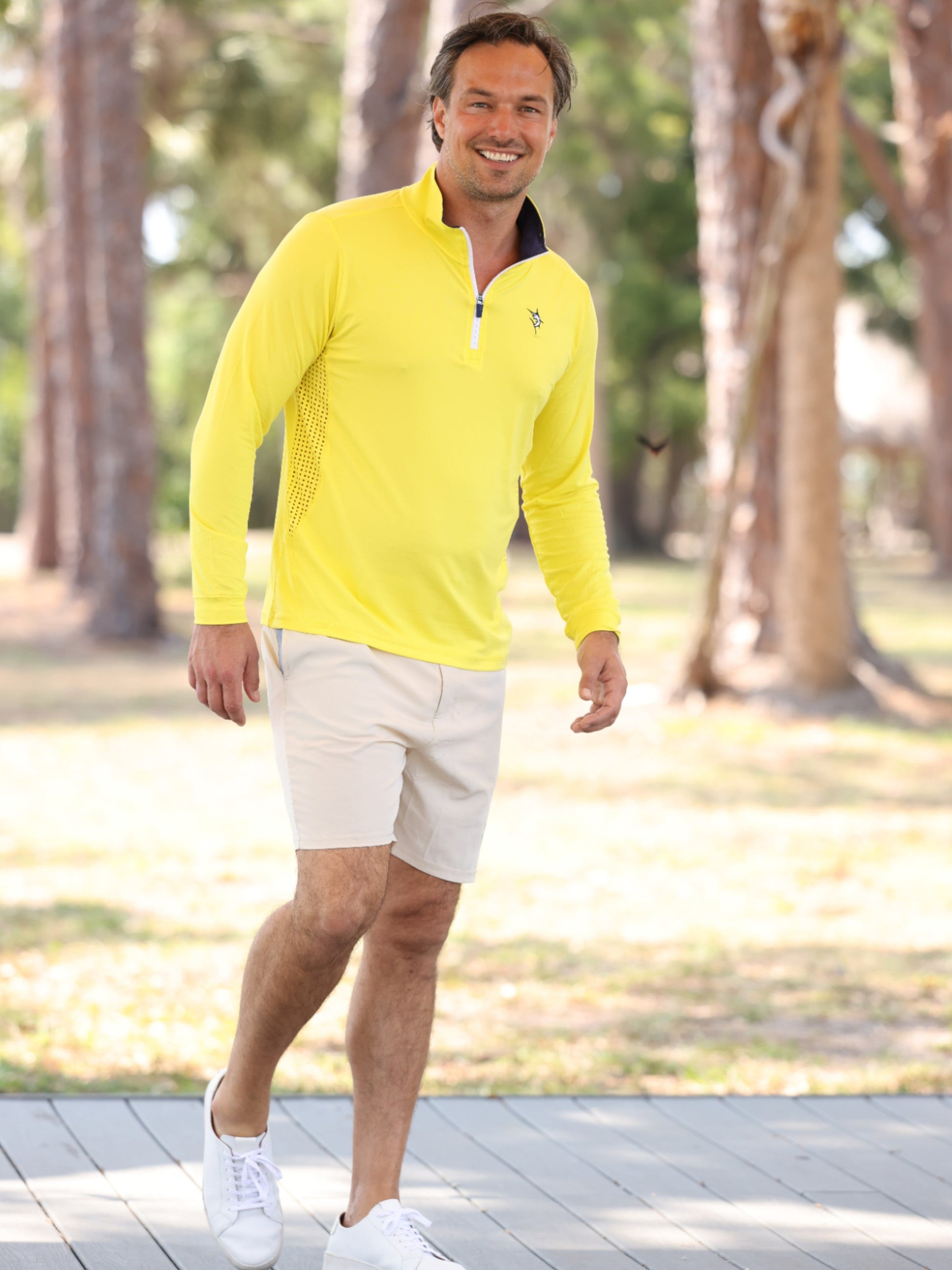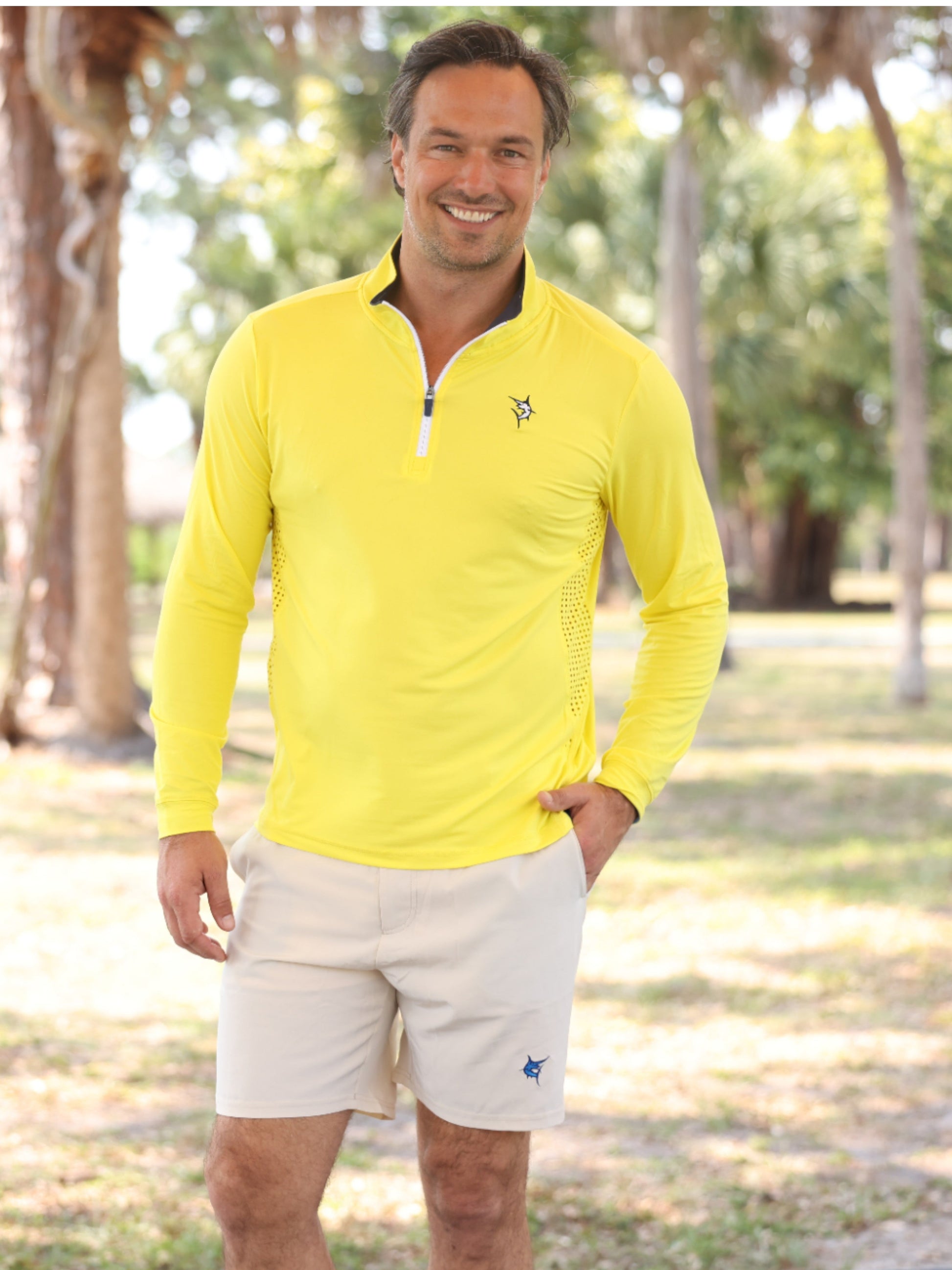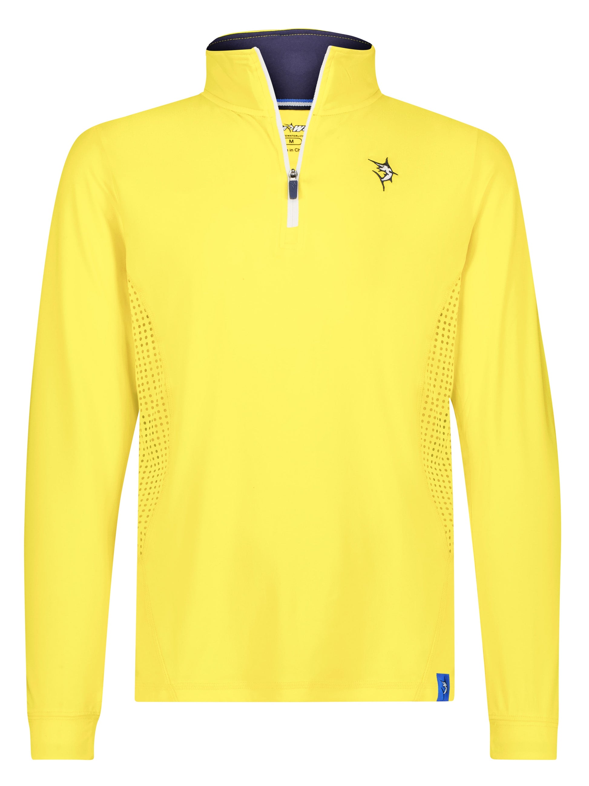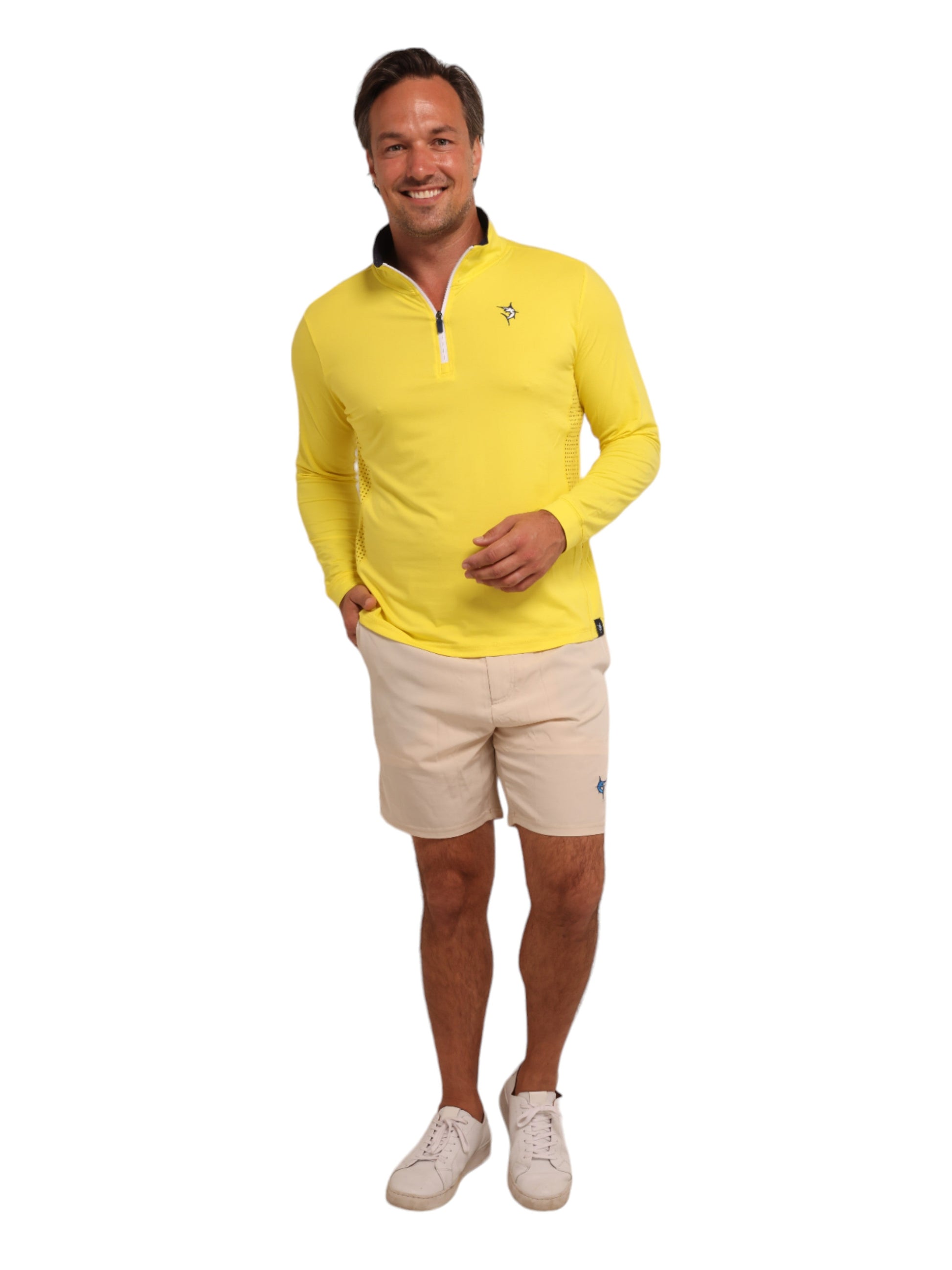Light weight performance quarter zip featuring soft poly spandex wicking fabric. Sun Protection, UV50 with laser insert venting to keep you cool when needed and patented silicone sleeve grip which holds your sleeves in place and keeps them clean. Perfect for every day.