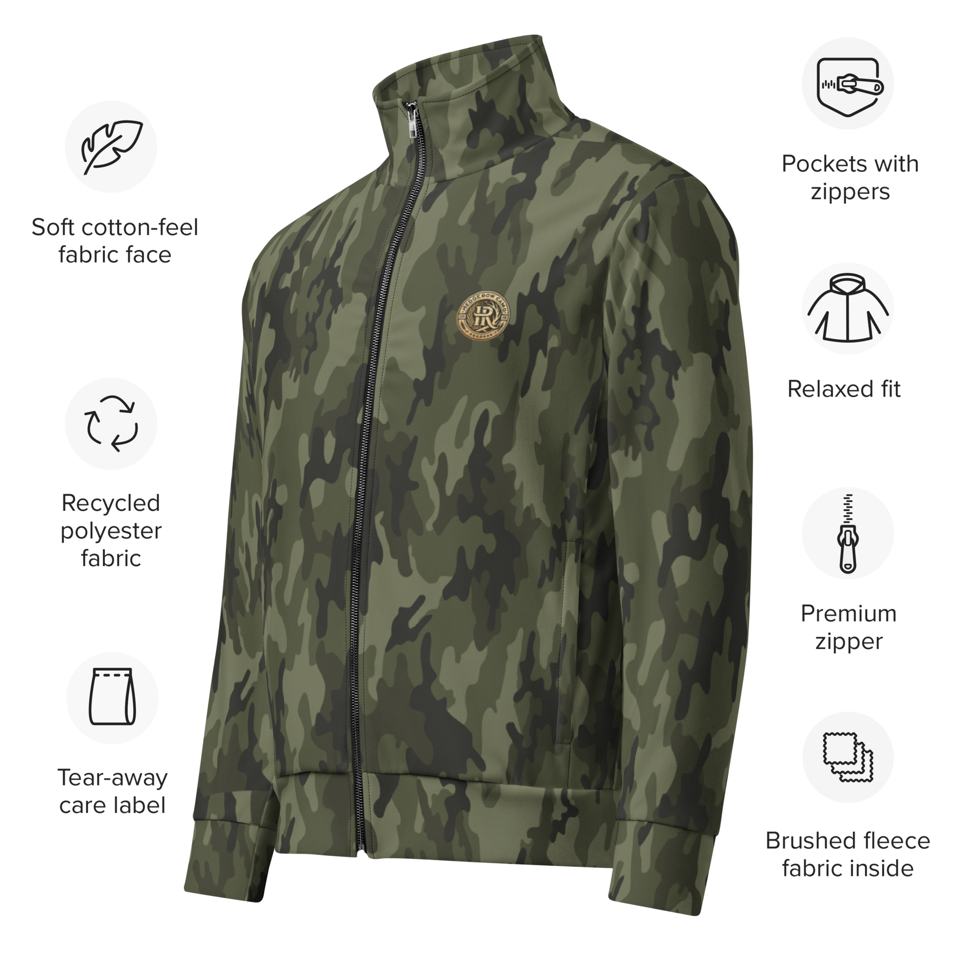 Stay warm, stylish, and eco-conscious with The Casual Camo Company Track Jacket, featuring our signature HedgeRow Camo design. Built for the outdoors but versatile enough for everyday wear, this jacket blends sustainable materials with comfort and performance.