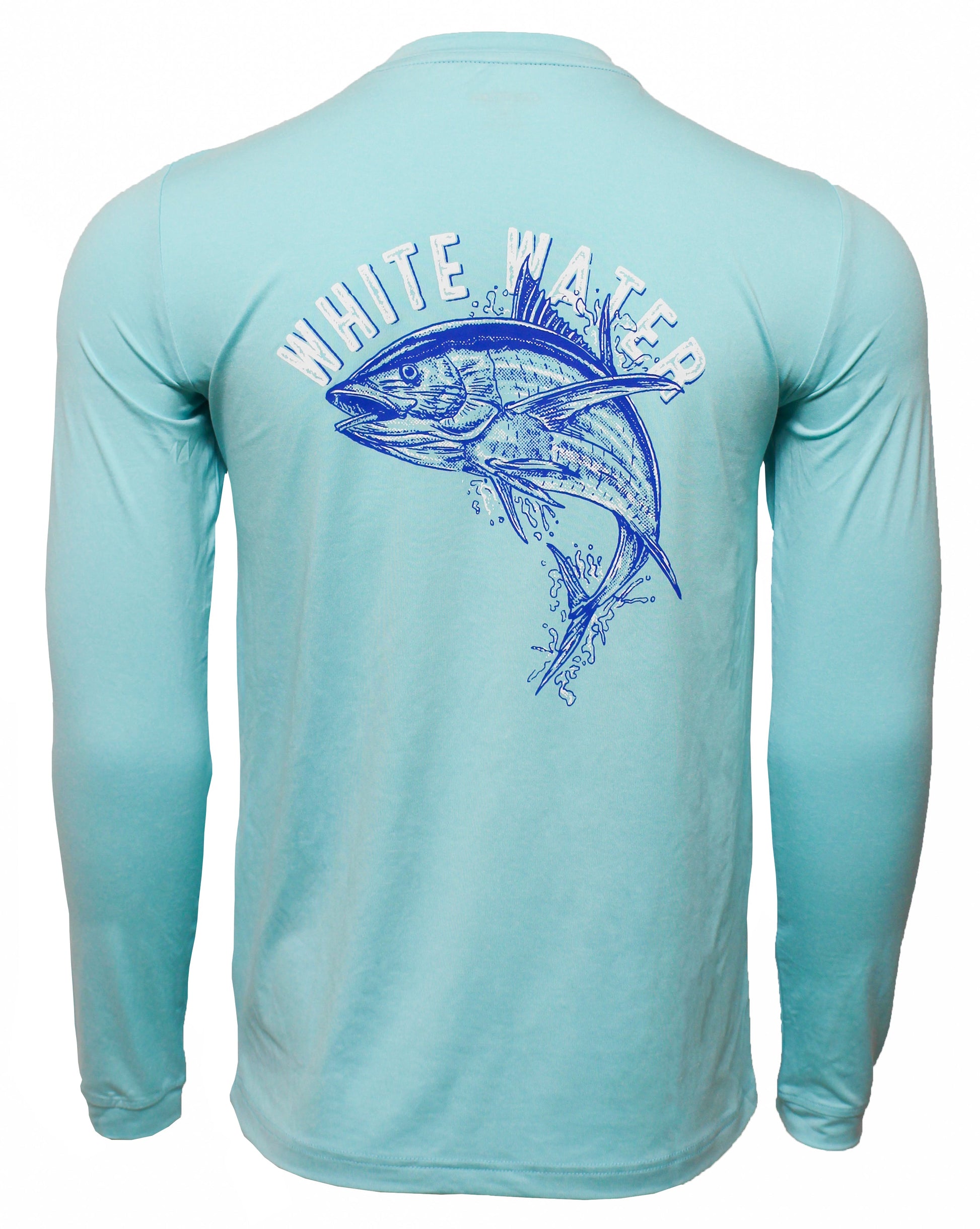 Our “Hydroflex” performance tee comes in our Proprietary UV50, 360 Flex Stretch speed dry fabric, which we brushed for the ultimate hand feel, added stretch for ultimate mobility and comfort. You may be hard pressed to believe this is a performance fabric and not cotton. This garment features a printed left chest White Water Primary logo and a tuna graphic on the back.